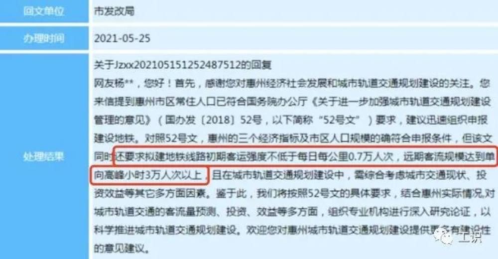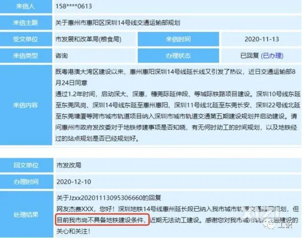 惠州的城市轨道交通线网规划在2018年就已经发布了,但迟迟未动工。2020年还有市民咨询政府邮箱,得到的官方恢复是: