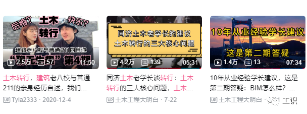 在B站输入“建筑土木”,下方自动弹出“建筑土木转行”的关键词,你会看到很多过来人制作出的“建筑转行互联网”、“大型公益劝退篇”之类的高播放视频。