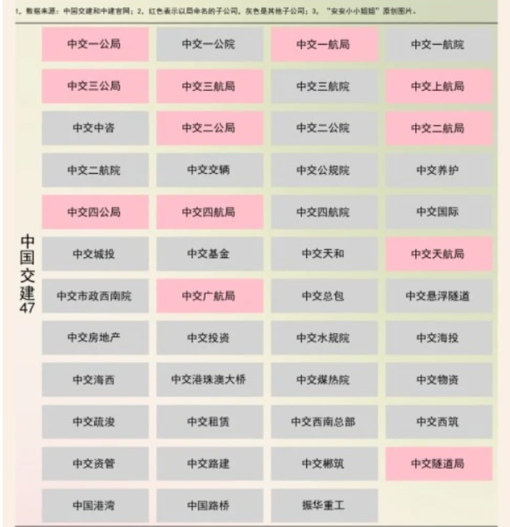 目前,中国交建已经成功在香港、上海两地上市,并且位居《财富》世界500强第60位,集团拥有60多家全资、控股子公司,而根据网上数据不完全整理显示,中国交建的子公司如下图所示,数量在47家左右。