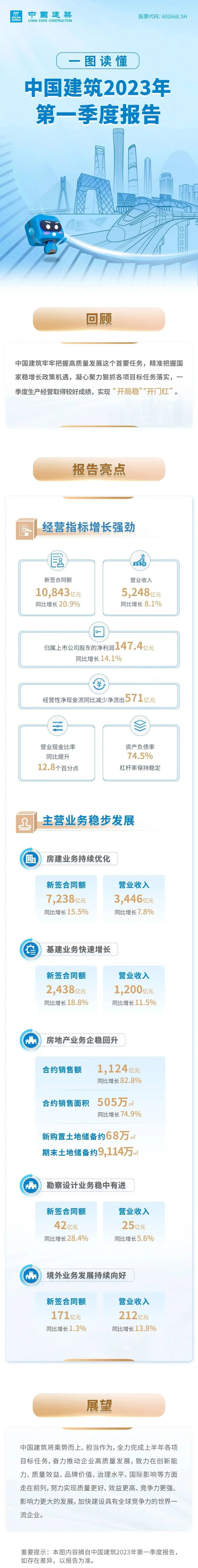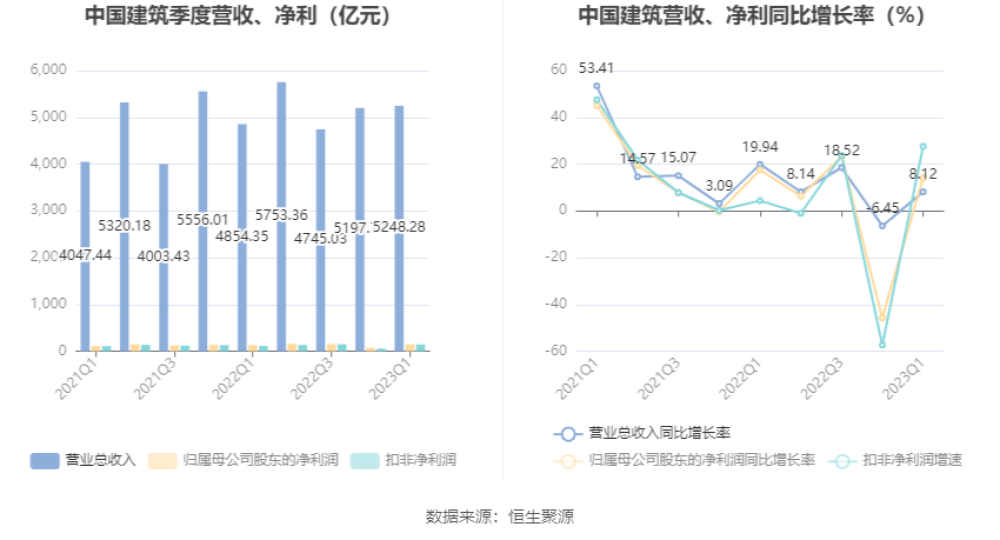 4月28日,中国建筑(601668)披露2023年第一季度报告。报告期内公司实现营业总收入5248.28亿元,同比增长8.12%;归母净利润147.45亿元,同比增长14.11%。
