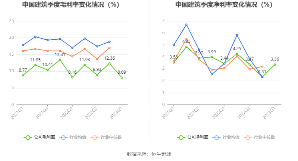 财报数据显示,2023年一季度,中国建筑毛利率为8.09%,同比下降0.07个百分点,环比下降4.27个百分点;净利率为3.36%,较上年同期下降0.08个百分点,较上一季度上升1.05个百分点。