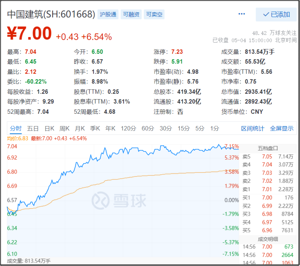 5月4日,截止下午A股收盘,中国建筑盘中涨6。54%,股价达7元,刷新历史高点,总市值逼近3000亿元,当日成交额55.53亿元。