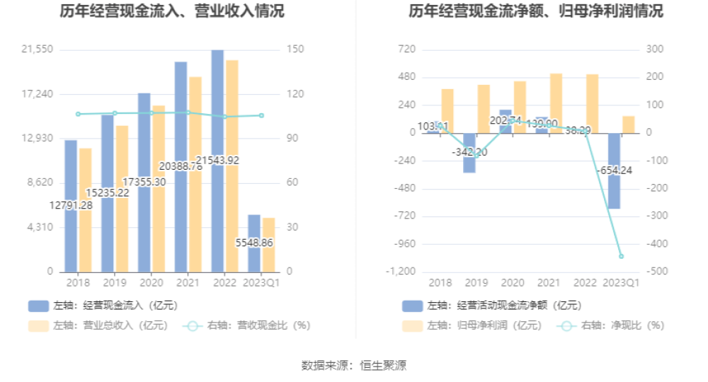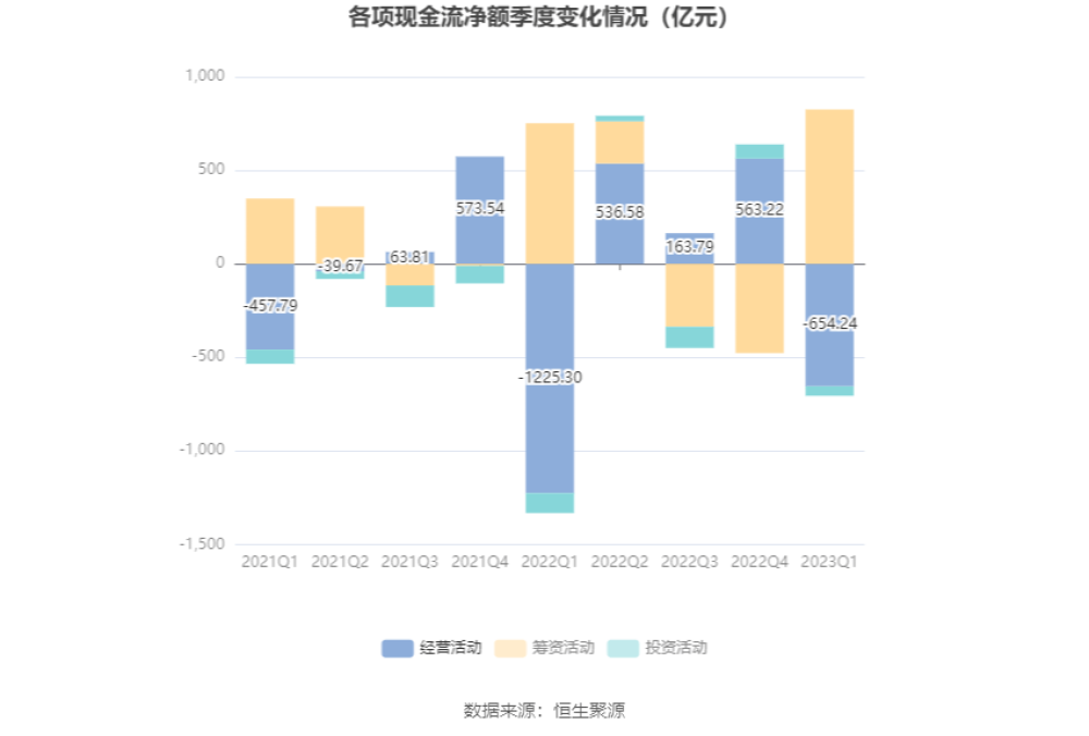 截至2023年一季度末,公司经营活动现金流净额为-654.24亿元,同比增加571.06亿元,环比下降1217.46亿元;筹资活动现金流净额825.23亿元,较上年一季度末增长73.38亿元;投资活动现金流净额-51.25亿元,上年同期为-106.44亿元。