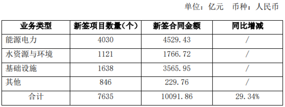 中国电建发布2022年1月至12月主要经营情况公告,公告显示,2022年1月至12月,公司累计新签项目7635个,新签合同金额10091.86亿元人民币,同比增长29.34%。其中,新签能源电力项目4030个,新签合同金额达到4529.43亿元人民币。