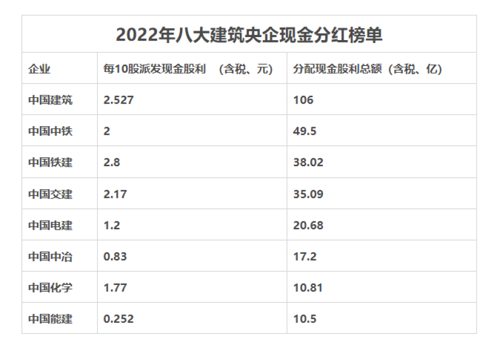 根据八大建筑央企公布的2022年财报整理的分红榜单,可以清晰看到八大建筑央企的实力都不容小觑,甚至中国建筑凭着实力遥遥领先。