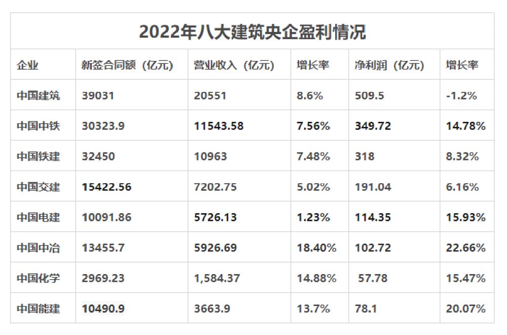 为了更好地了解其中的信息,我们根据八大建筑央企公布的财报信息整理出了,它们在2022年度的盈利情况。