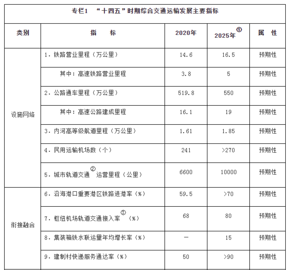 注:①〔〕内为5年累计数。②指纳入国家批准的城市轨道交通建设规划中的大中运量城市轨道交通项目。③指国际枢纽机场和区域枢纽机场中连通轨道交通的机场数量占比。④指重点营运车辆、邮政快递自有干线运输车辆、应安装具备卫星定位功能船载设备的客船及危险品船等。⑤指新能源公交车辆占所有地面公交车辆的比重。⑥指按单位运输周转量计算的二氧化碳排放。